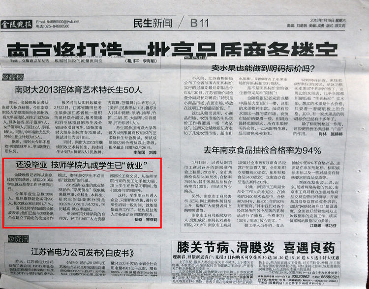 《金陵晚报》B11版—《还没毕业 技师学院九成学生已“就业”》