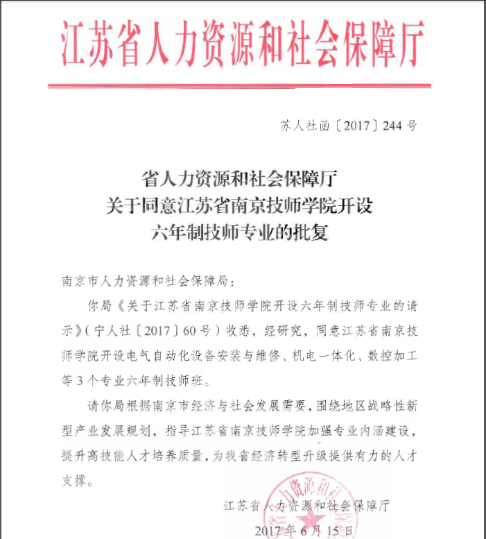 我院接到《省人力资源和社会保障厅关于同意江苏省安博电竞·(anbo)官方网站开设六年制技师专业的批复》(苏人社函[2017]244号),同意开设电气自动化设备安装与维修、机电一体化、数控加工等3个专业。