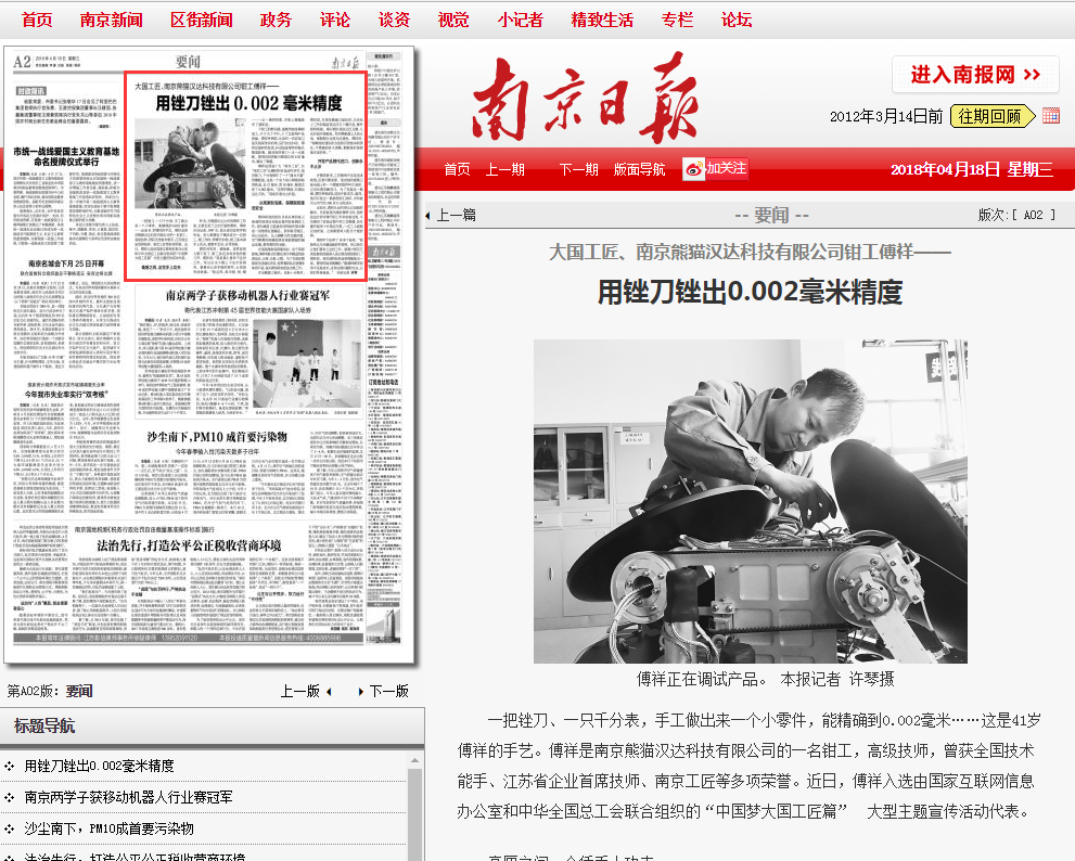 《南京日报》A02大国工匠、南京熊猫汉达科技有限公司钳工傅祥——用锉刀锉出0.002毫米精度