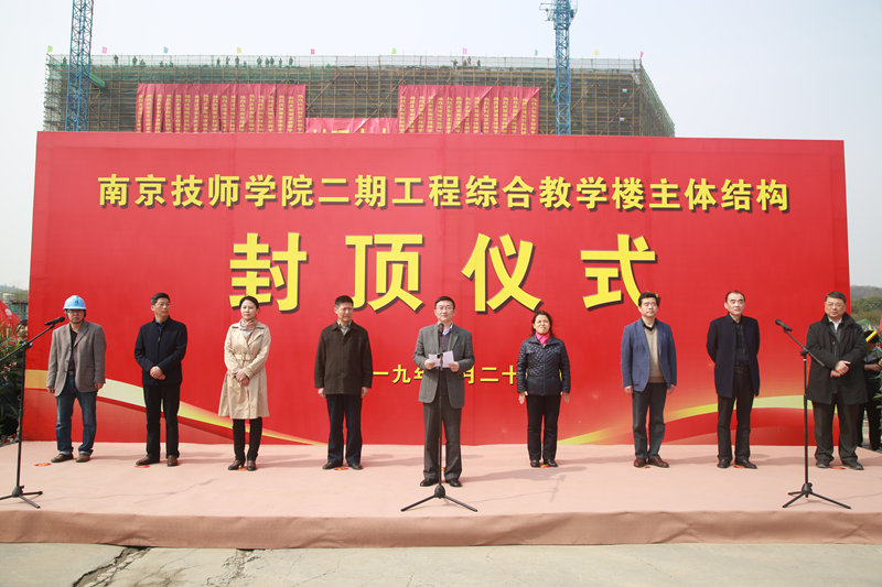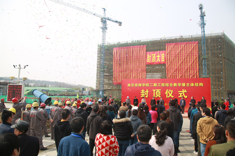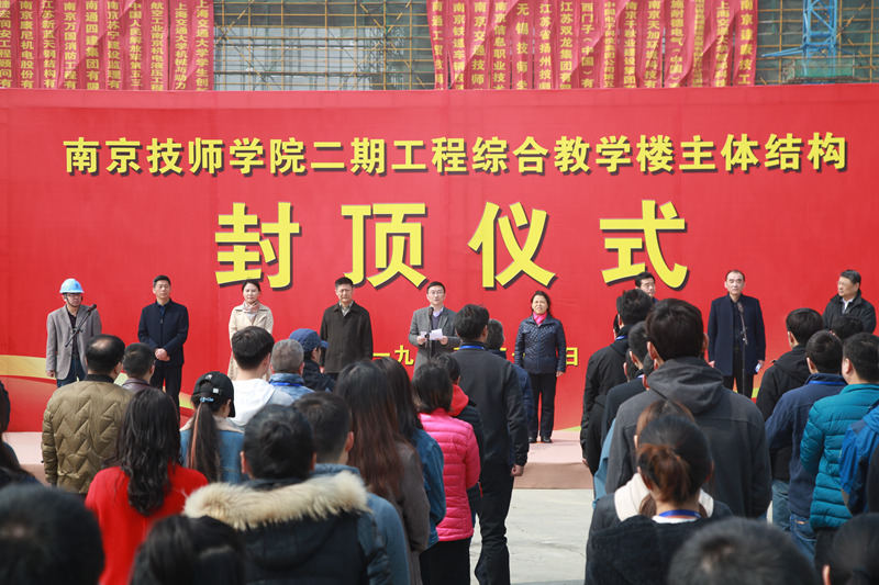 3月24日上午,安博电竞·(anbo)官方网站举行二期工程综合教学楼主体结构封顶活动。市人社局党组书记、局长刘莅,仙林大学城管委会党工委委员、副主任孙金娣,市人社局巡视员周政学,副巡视员郁永春,江苏省建筑设计研究院有限公司、南京苏宁建设监理有限公司、南通四建集团有限公司等参建单位负责人以及学院部分教职工代表约100人参加活动。