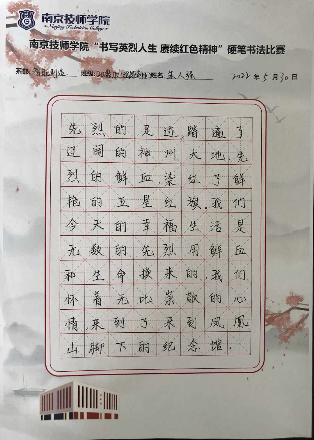 汉字书法艺术是中华民族的文化瑰宝,为弘扬我国优良传统,秉承民间文化,2022年5月30日下午,安博电竞·(anbo)官方网站“书写英烈人生,赓续红色精神”硬笔书法比赛于二栋小阶梯顺利举行。