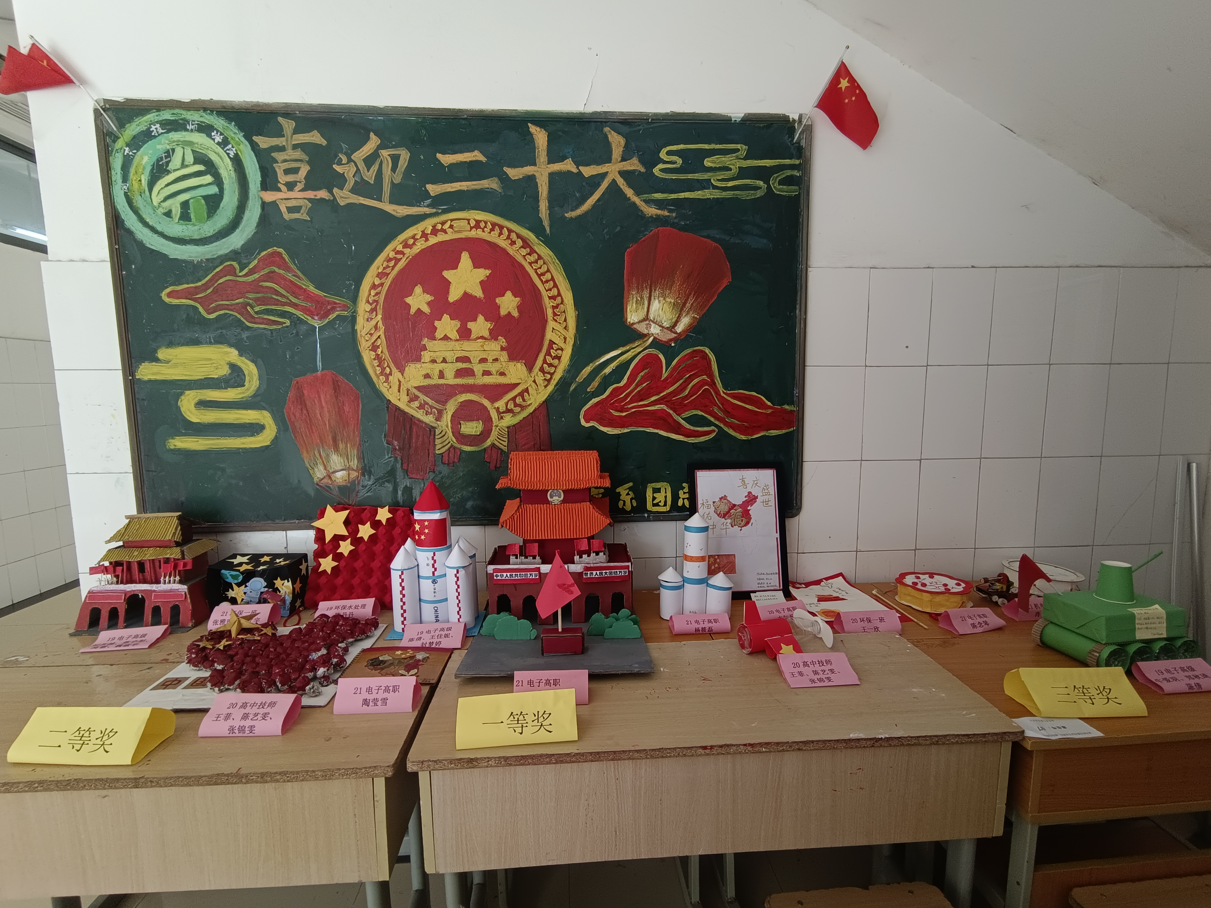 同学们用饮料瓶、快递盒、鸡蛋盒以及卡纸等环保材料,充分发挥创意,用巧手制作出了精美的国旗、中国地图、天安门模型、长征系列火箭等作品,描绘了祖国繁荣昌盛的图景,饱含了对党和国家的热爱与赞颂,表达了对中华民族伟大复兴中国梦的美好期盼。