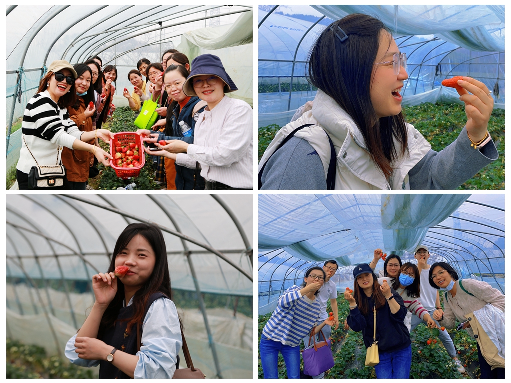 游览公园结束后,女教工们又来到汤山七坊的草莓园,大棚里一排排红彤彤的草莓成熟飘香,大家穿梭在各个大棚草莓地里,挑选最大最红的草莓放进自己的采摘篮中,悠闲地享受采摘的乐趣。