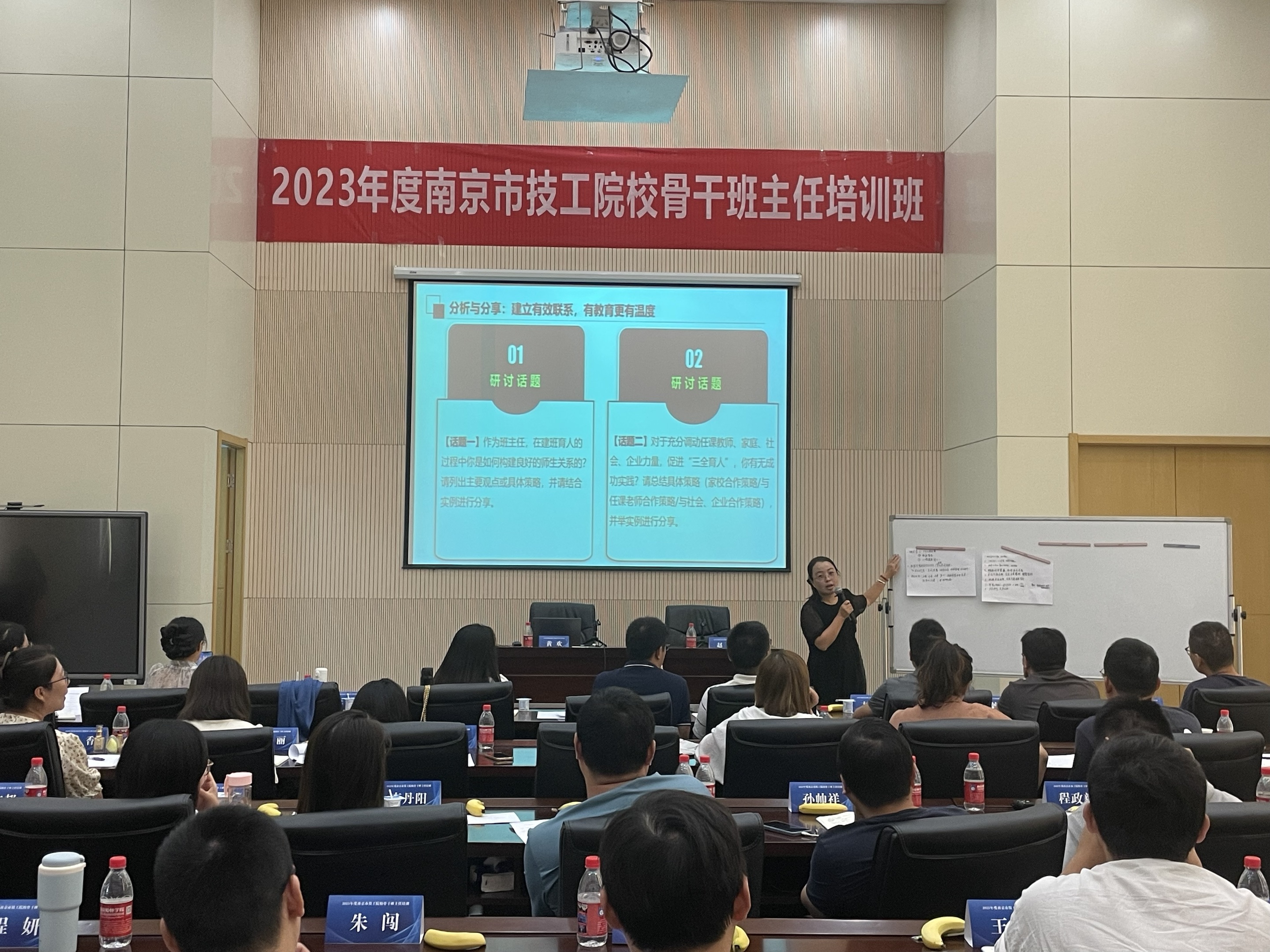 本次培训邀请了南京职教(成人)教研室林德华主任、南京中医药大学曾智教授、南京金陵高等职业技术学校刘娟老师、南京市职业学校名班主任工作室黄欢老师进行授课。内容包含专题讲座和班主任工作沙龙等,通过教育专家对班主任工作现身说法,加深了参训学员对班主任工作的新认识。