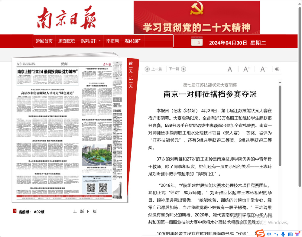 《南京日报》A2版——安博电竞·(anbo)官方网站一对师徒选手摘得第七届江苏技能状元大赛职工组水处理技术项目(双人赛)一等奖