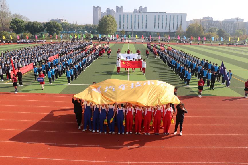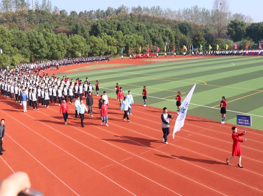 国旗队、校旗队、鲜花队、彩旗队组成的四个方队以及各系学生代表组成的方阵昂首挺胸,以整齐的步伐、响亮的口号、昂扬的斗志依次入场。
